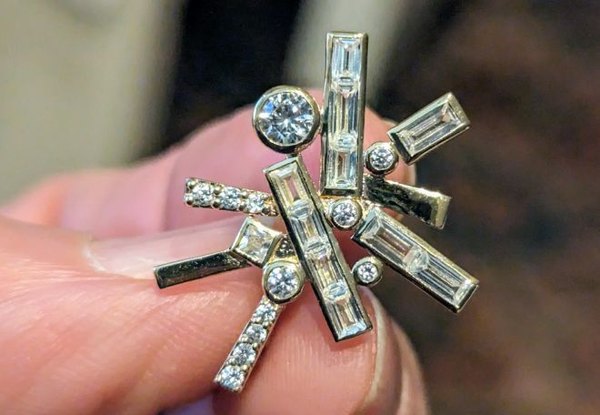 圆形、祖母绿切、公主方形切割的钻石与金属的纹理相映成趣,这种不规则的排列方式看似随意,却不经意间展现出了星星的光辉,给人带来新奇的视觉感受。