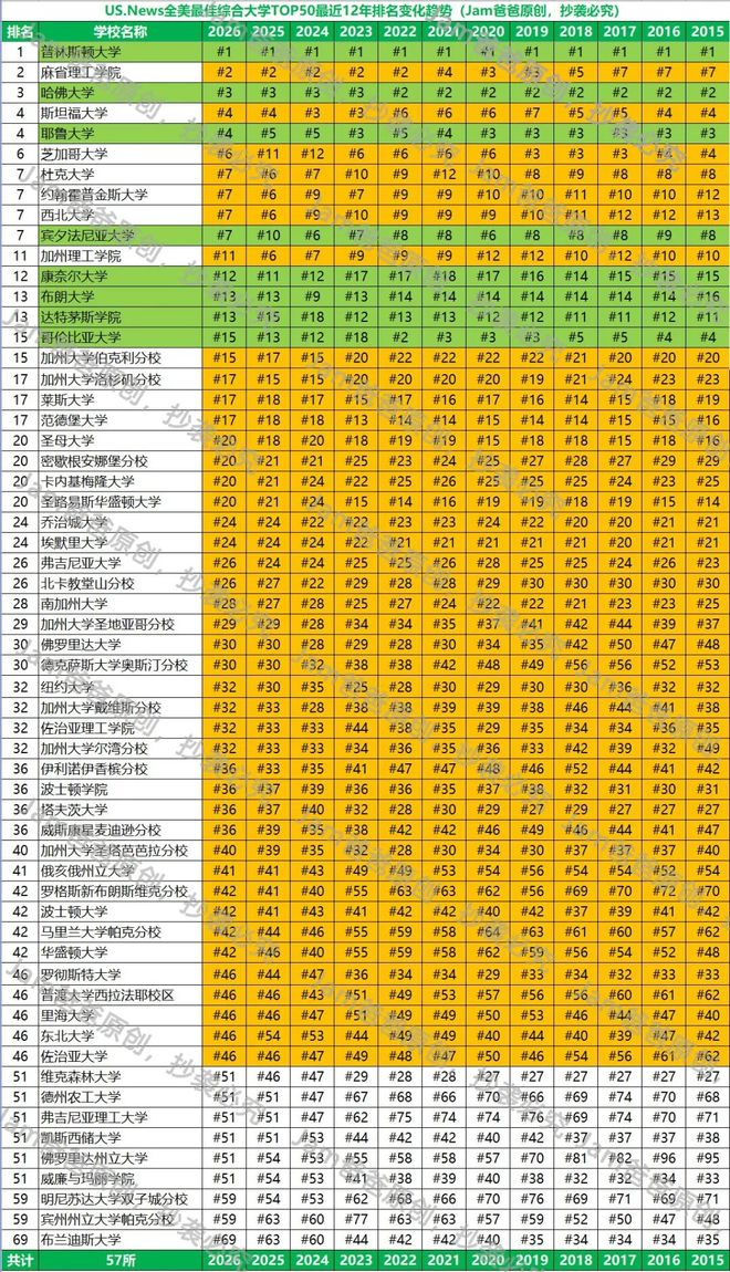 USNews美国大学12年排名变迁最稳定的是哪些牛校?