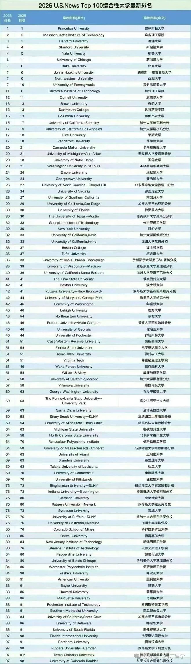 - 最新2026 USNews美国大学发布!普林保持第一CMU首进前20!2025-09-30