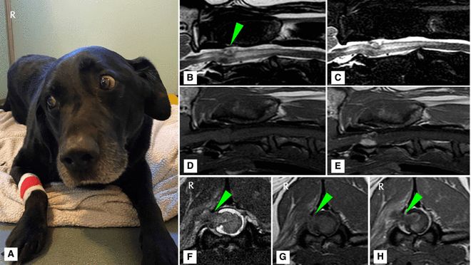 这是一只被诊断患有脊神经根肿块、头部右倾的小狗,它的磁共振成像显示一个管状肿块,沿着右侧脊神经的侵入脊髓髓质,造成明显的脊髓受压 / [11]