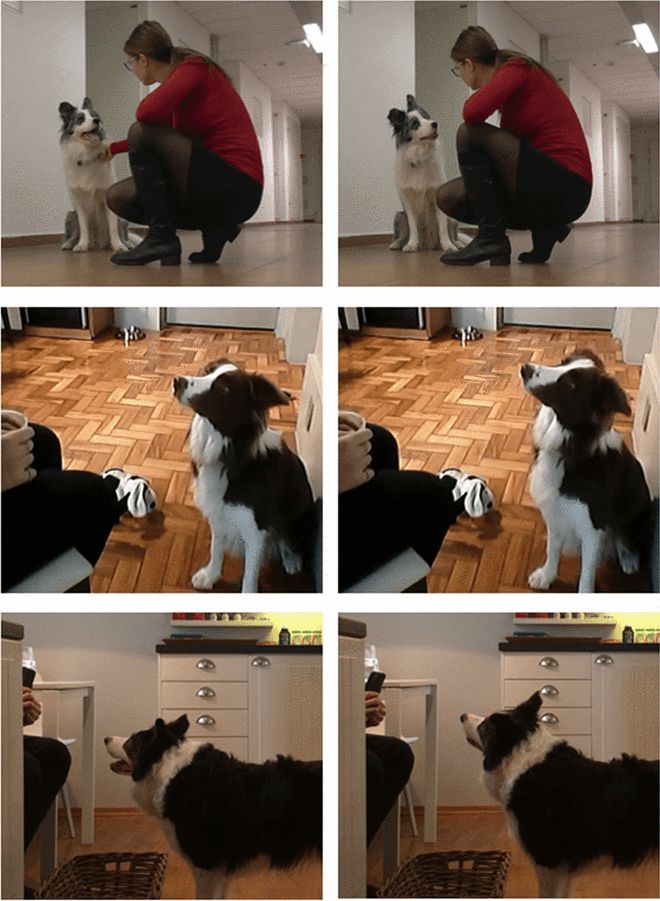 日本麻布大学大学研究人员通过实验发现,狗能够显著区分(用鼻子触碰照片)主人的微笑和空白表情(选对微笑表情给奖励),但对与主人不同性别陌生人的微笑,狗的表现并不如对主人那样准确 / [15]